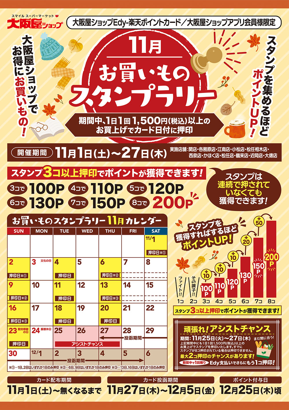 ※期間中、スタンプラリー実施店舗にて1日1回1,500円(税込)以上のお買上でカード日付に押印させて頂きます(1マスに複数ある場合、いずれか1日のみ押印・レシートの合算不可)