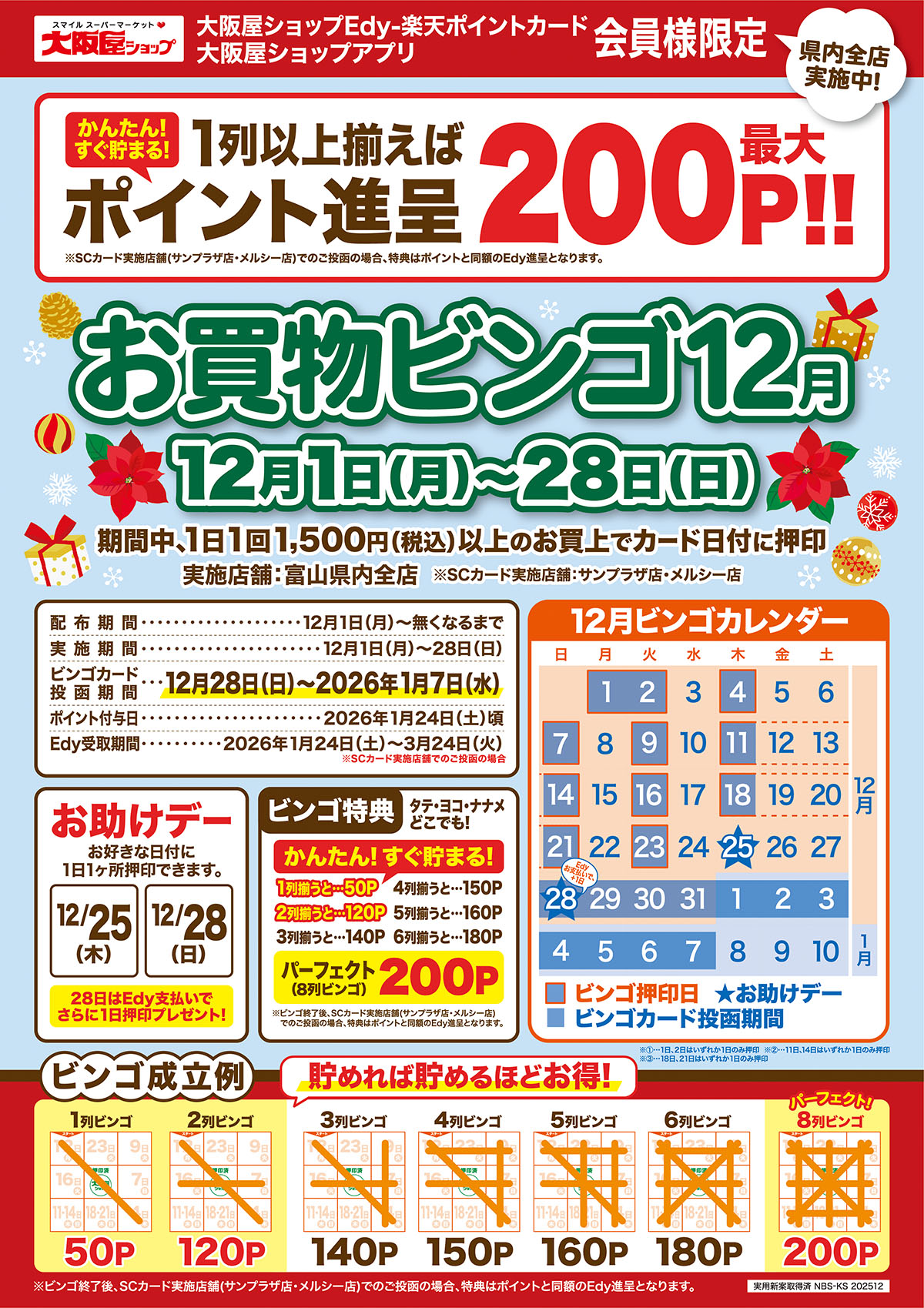 ※ビンゴカードは1枚で実施全店共通利用が可能です。ただし、SCカード実施店舗(サンプラザ店、メルシー店)でのご投函の場合、特典はポイントと同等のEdyギフト進呈となります