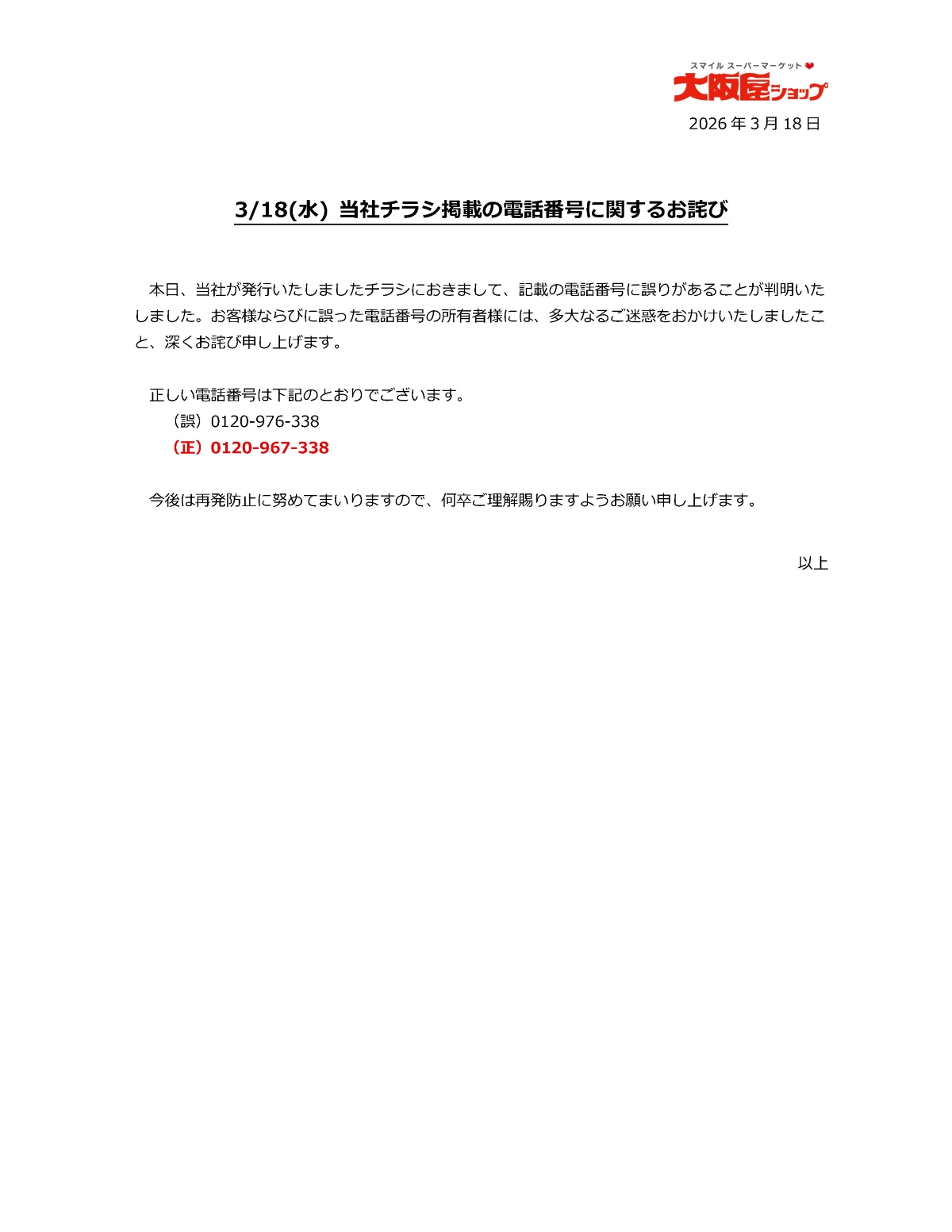 3/18(水) 当社チラシ掲載の電話番号に関するお詫び