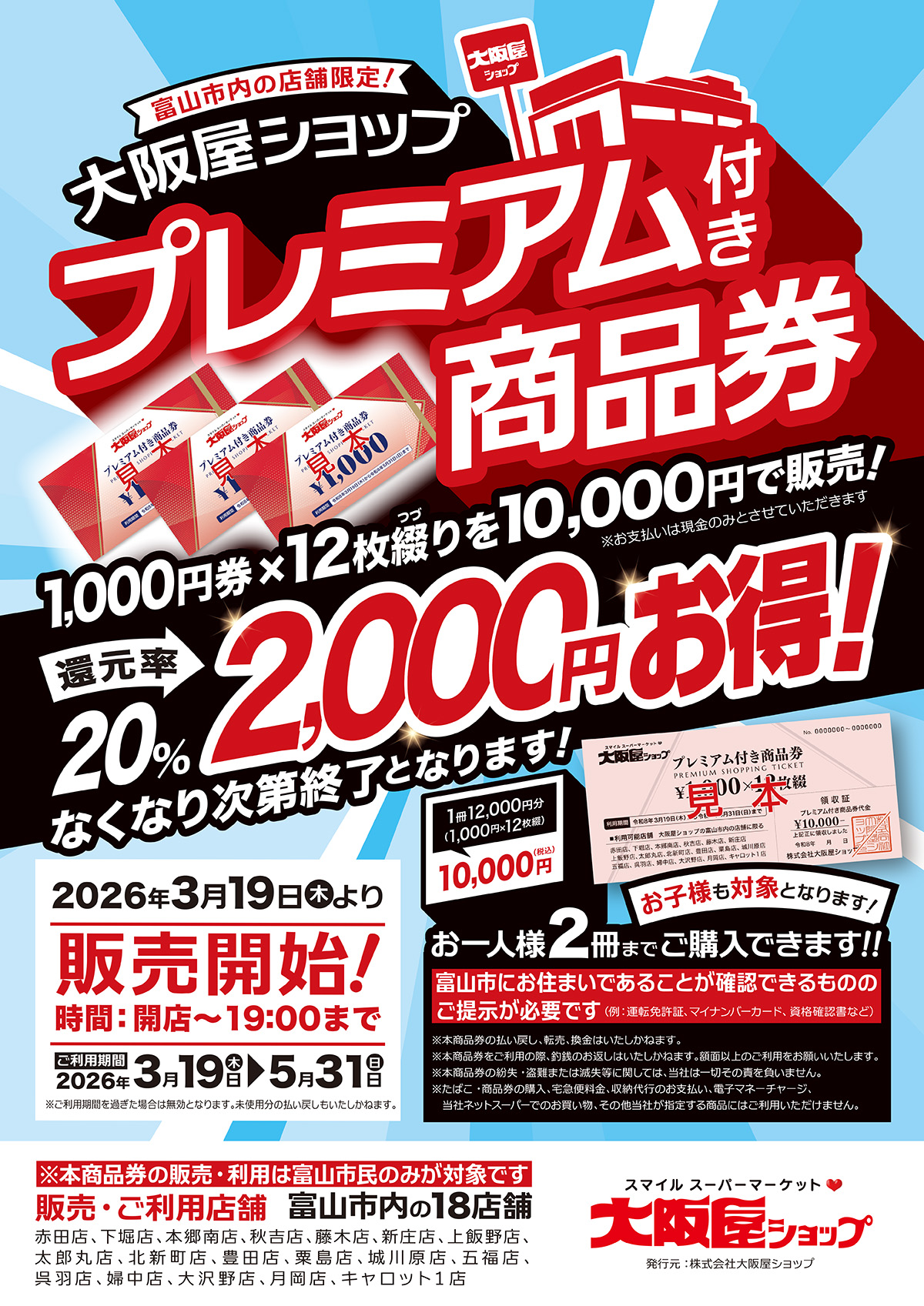 【富山市民限定】3/19(木)より、大阪屋ショップ プレミアム付き商品券 販売開始!